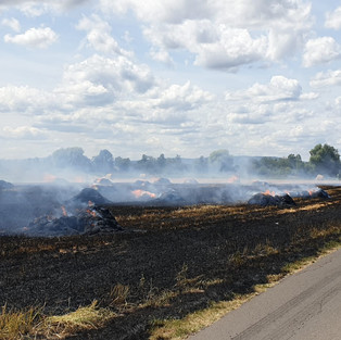 Hier standen beim Eintreffen der Kräfte etliche Rundballen in Flammen. Die zuerst eingetroffenen Feuerwehren starteten mit dem Sichern der umliegenden Felder. Mit Mistgabeln und Einreisharken zogen die Einsatzkräfte die Rundballen auseinander, damit diese kontrolliert anbrennen konnten.